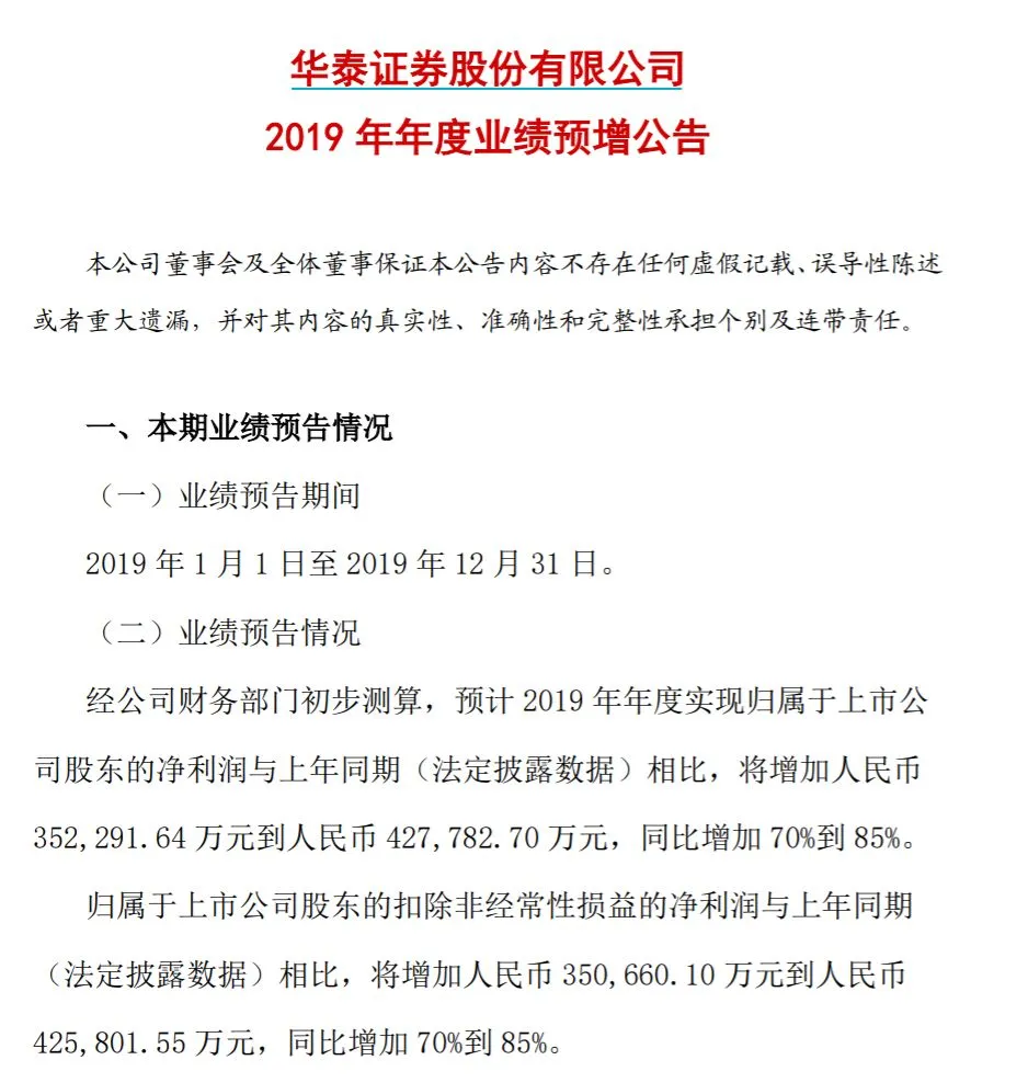 华泰证券发布的业绩预增公告显示,预计2019年归母净利润同比增加35.23亿元到42.78亿元,上一年度为50.33亿元。也就是说,华泰证券全年归母净利润将在85.56至93.11亿之间;国泰君安披露的全年业绩快报数据显示,公司2019年归母净利润为86.26亿元。