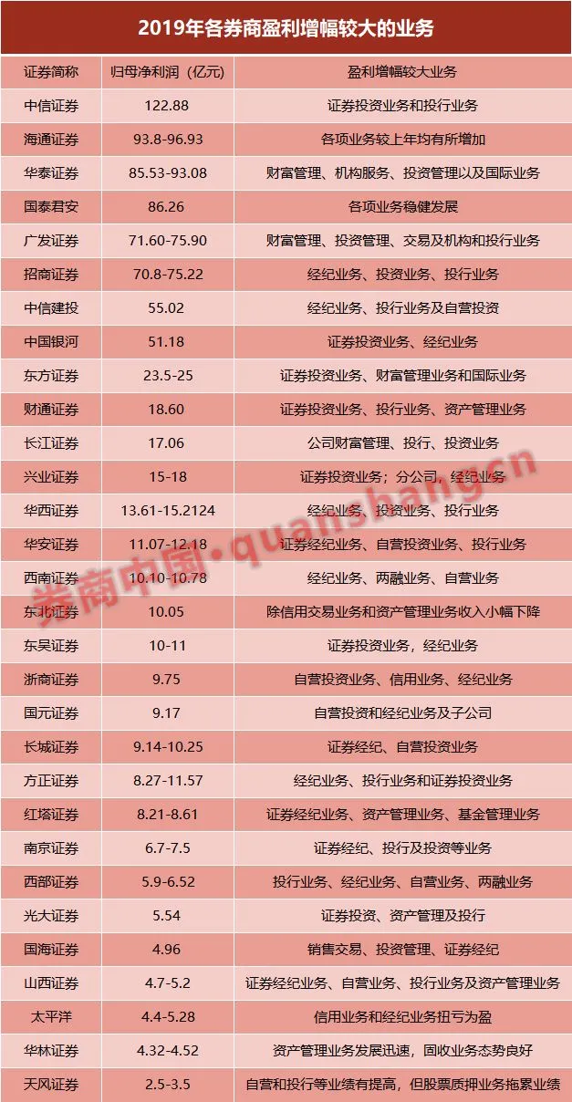 至少有25家券商在业绩预增原因中都表述,经纪业务或财富管理业务盈利增幅较大。比如华泰证券表示,A股市场整体回暖,沪深股票市场主要指数上行,两市交投活跃,融资规模显著增长,通过坚定推进科技赋能下的“双轮驱动”发展战略,财富管理、机构服务、投资管理以及国际业务等主要业务线收入均实现同比增长;中国银河表示,2019年,公司把握市场机遇,坚定推进业务转型,优化大类资产配置,证券投资业务收入、经纪业务收入均较上年实现较大幅度增长。