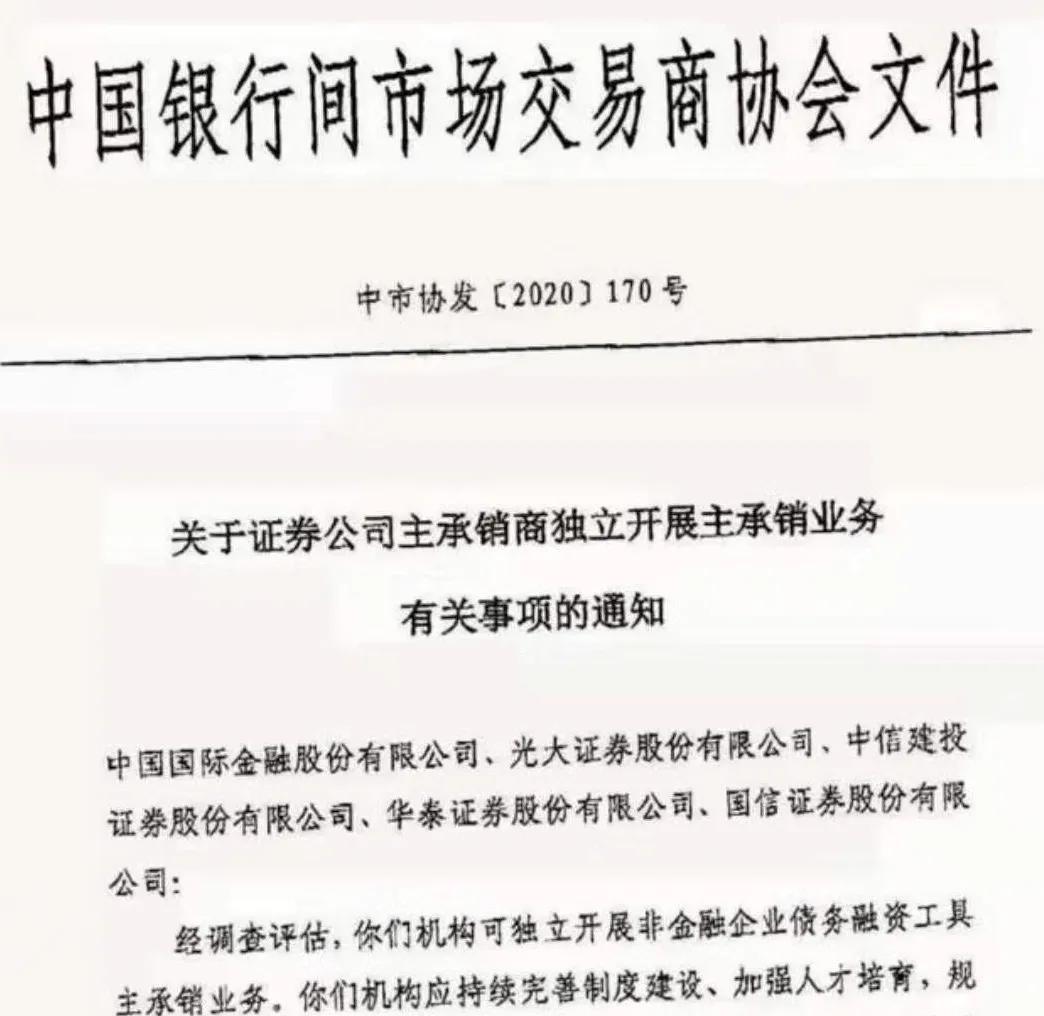 券商中国记者了解到,12月18日中国银行间市场交易商协会向券商发布一份《关于证券公司主承销商独立开展主承销业务有关事项的通知》(以下简称《通知》)。根据该《通知》,中金公司、光大证券、中信建投、华泰证券、国信证券共5家券商,经银行间市场交易商协会调查评估后,被允许可独立开展非金融企业债务融资工具主承销业务。上述名单中有券商向记者证实了该《通知》的真实性。