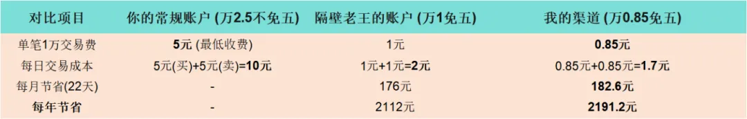 你可能觉得,万2.5和万1,差距不大嘛,交易一万块,也就差1.5元。但你忽略了最致命的一点——“最低5元收费”。