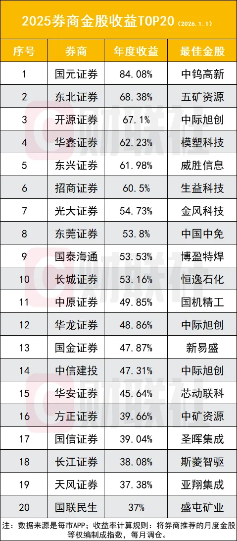 2025年A股圆满收官,主要指数全年全线飘红,券商金股组合同步交出亮眼成绩单。数据显示,年度收益排名前十的券商金股组合收益率均突破50%。具体来看,TOP10券商依次为:国元证券(84.08%)、东北证券(68.38%)、开源证券(67.1%)、华鑫证券(62.23%)、东兴证券(61.98%)、招商证券(60.5%)、光大证券(54.73%)、东莞证券(53.8%)、国泰海通(53.53%)、长城证券(53.16%)。除TOP10外,跻身券商月度金股组合收益TOP20的券商还包括中原证券(49.85%)、华龙证券(48.86%)、国金证券(47.87%)、中信建投(47.31%)、华安证券(45.64%)、方正证券(39.66%)、国信证券(39.04%)、长江证券(38.08%)、天风证券(37.38%)、国联民生(37.0%)。11家券商合计发布了超100多只1月金股,其中科技股和周期股最受青睐。2025年A股市场震荡走强,沪指多次触及4000点。受政策利好催化、市场风险偏好回暖等因素影响,2025年12月A股市场整体上涨,市场赚钱效应良好。近期,券商陆续发布1月策略报告,并同步推出1月券商金股。从各大券商的观点来看,大家总体看好2026年的行情,提示积极布局春季躁动。科技和周期复苏主线最受关注