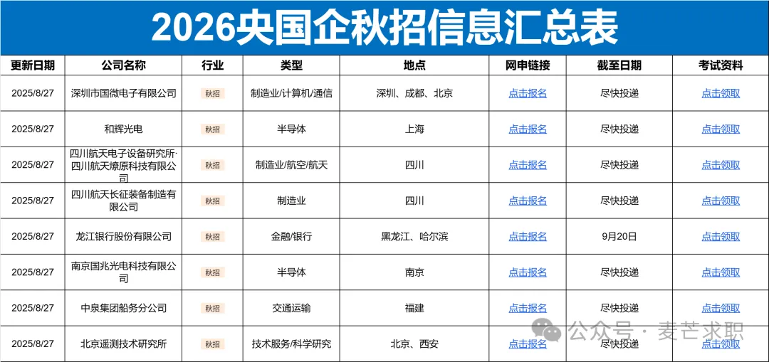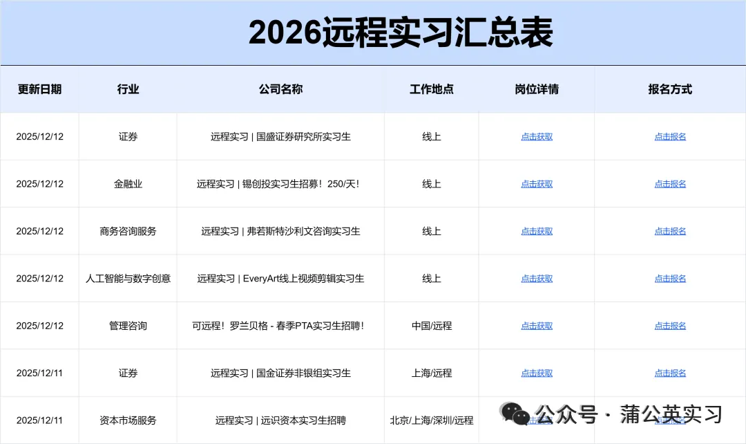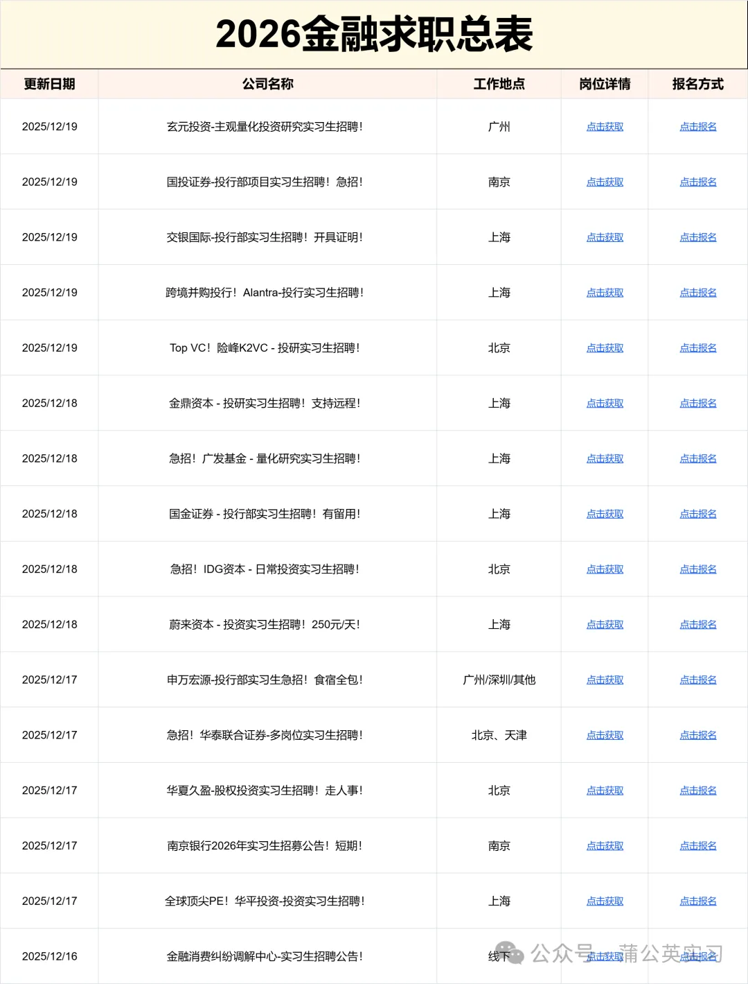 2:我们会定期整理汇总表,分时间:春招/秋招网申汇总表、寒暑假实习信息汇总表、远程实习信息汇总表等...分行业:国企央企汇总表/金融/咨询/互联网/事务所/快消岗位汇总表/国家部委招聘信息等等,每周第一时间分享到VIP会员群!部分展示示如下👇
