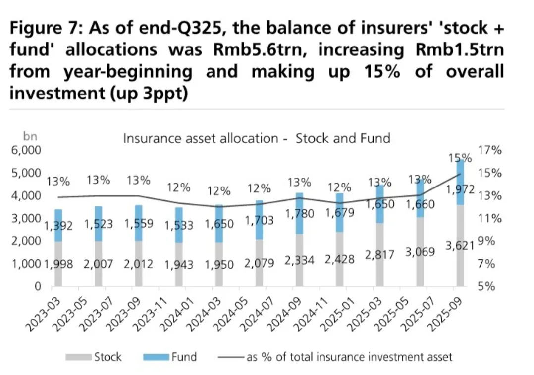 政策端的改革力度更是超出预期。金融监管总局下调保险公司权益投资风险因子,证监会则优化优质机构风控指标,适当放宽资本和杠杆限制,推动行业从价格竞争转向价值竞争。这意味着头部券商将获得更多资金运作空间,行业分化会进一步加剧。研报中Figure 7(保险公司股票+基金配置图表)显示,截至2025年三季度末,保险公司“股票+基金”配置余额达5.6万亿元,较年初增加1.5万亿元,占整体投资比例升至15%,长期资金入市的政策效果已逐步显现。