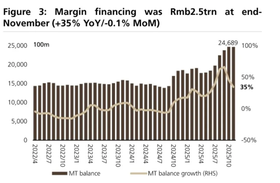 先看一组核心数据,直观感受市场热度。研报中Figure 2(股票+ETF日均成交额图表)显示,11月“股票+ETF”日均成交额达2.3万亿元,同比增长9%,虽然环比下降13%,但相比去年同期仍显强劲,这一数据印证了市场交易活跃度的韧性。而Figure 3(两融余额图表)更能说明资金面的积极信号,截至11月底两融余额2.5万亿元,同比大幅增长35%,仅环比微降0.1%,长期资金入市趋势明显。