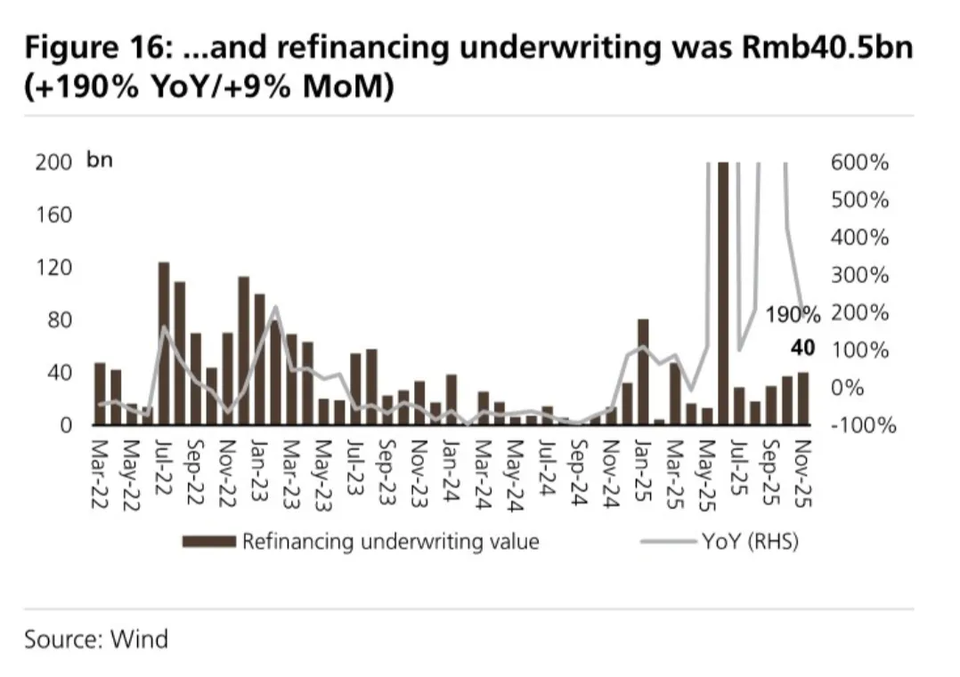 投行业务同样表现亮眼,Figure 16(再融资承销额图表)显示11月再融资承销额405亿元,同比激增190%,IPO承销额也同比增长95%,资本市场直接融资功能持续强化。