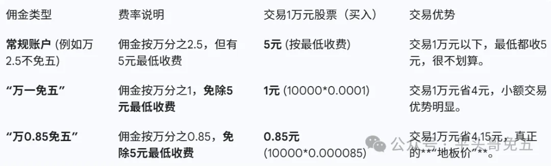 “万一免五”:即交易佣金按“万分之一”收取,且免去每笔5元的最低收费 。