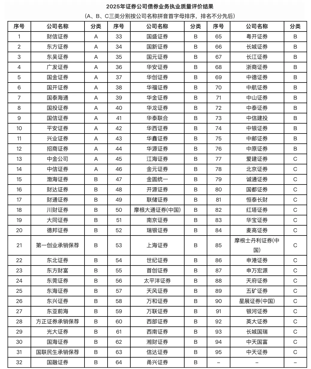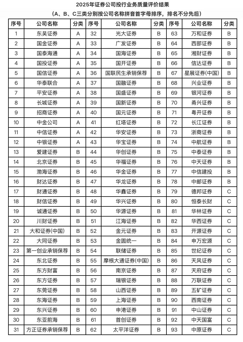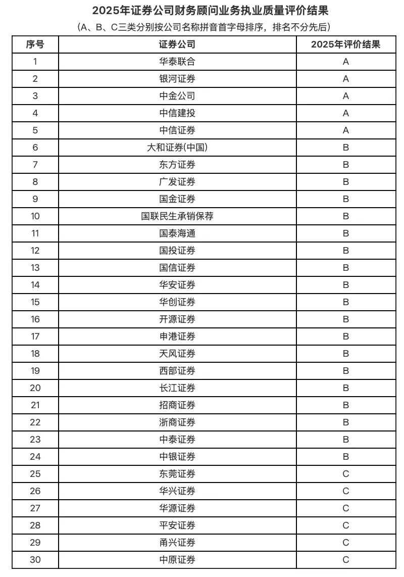 12月30日,中国证券业协会公布2025年证券公司投行、财务顾问和债券业务执业质量三份评价结果。