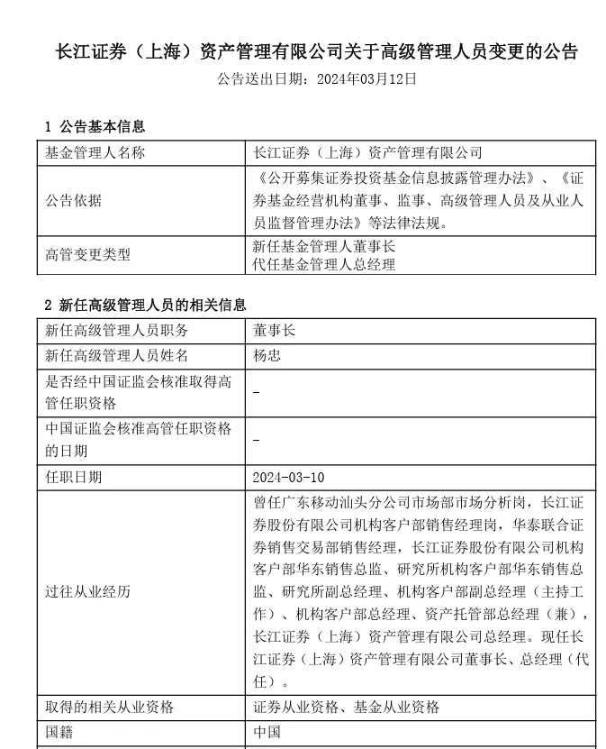 3月12日,长江证券(上海)资产管理有限公司(简称“长江资管”)发布相关高管变动公告,因工作调整,原董事长高占军离任,原总经理杨忠接任新董事长,并代任总经理一职。