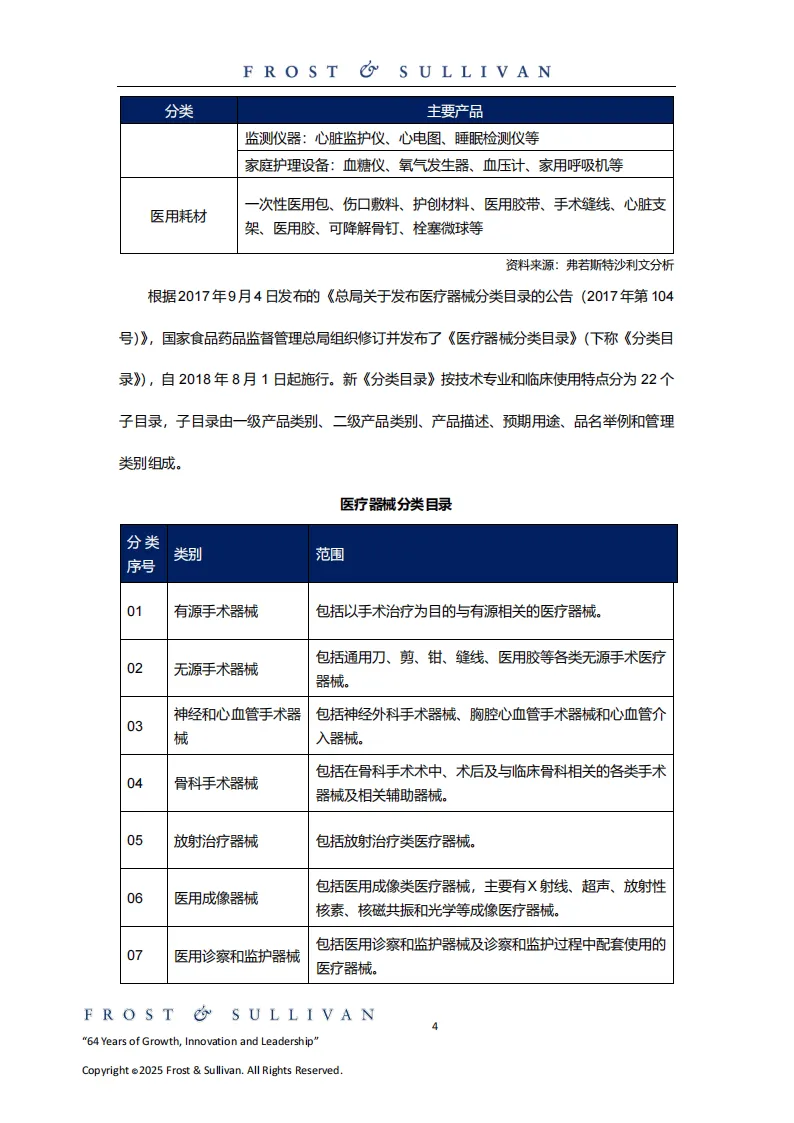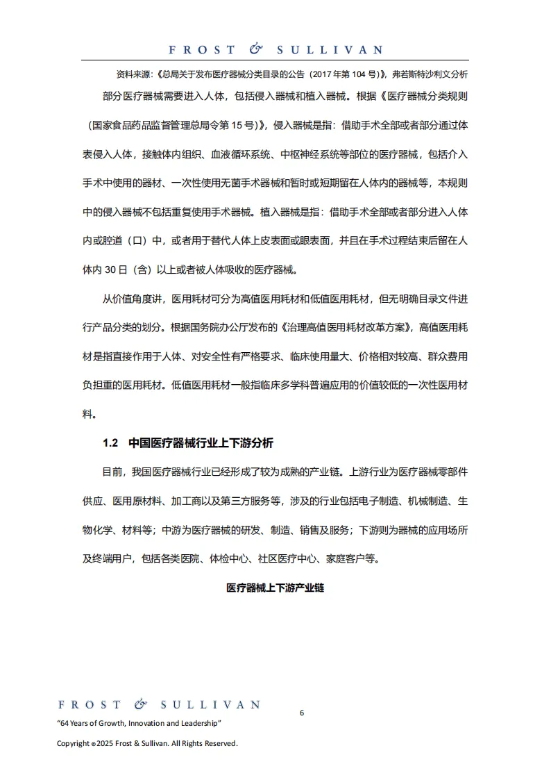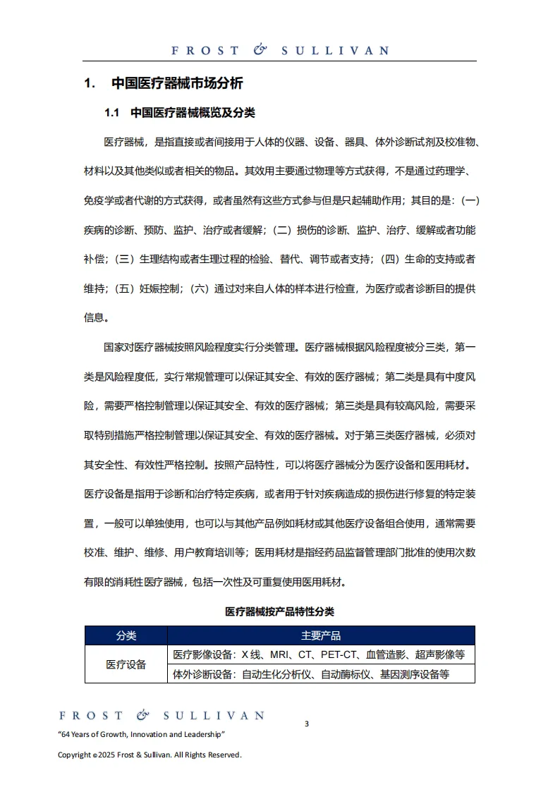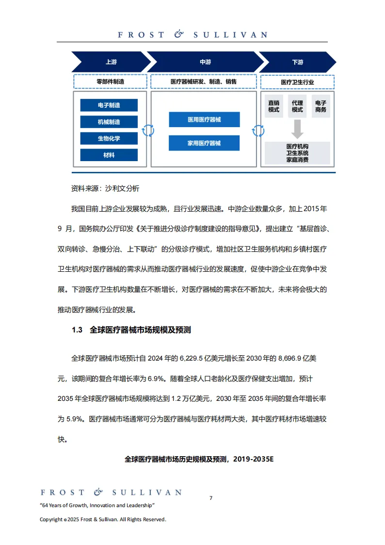 医疗器械是直接或间接用于人体的各类仪器、设备及材料等,按风险程度分为三类,按产品特性可分为医疗设备和医用耗材,涵盖22个子目录,形成了上游为零部件与原材料供应、中游为研发制造销售、下游面向各类医疗机构及家庭用户的成熟产业链。全球医疗器械市场规模预计2030年达8696.9亿美元,2035年将增至1.2万亿美元;中国市场2024年已达9417.3亿元人民币,2035年有望突破1.8万亿元人民币,保持稳定增长。