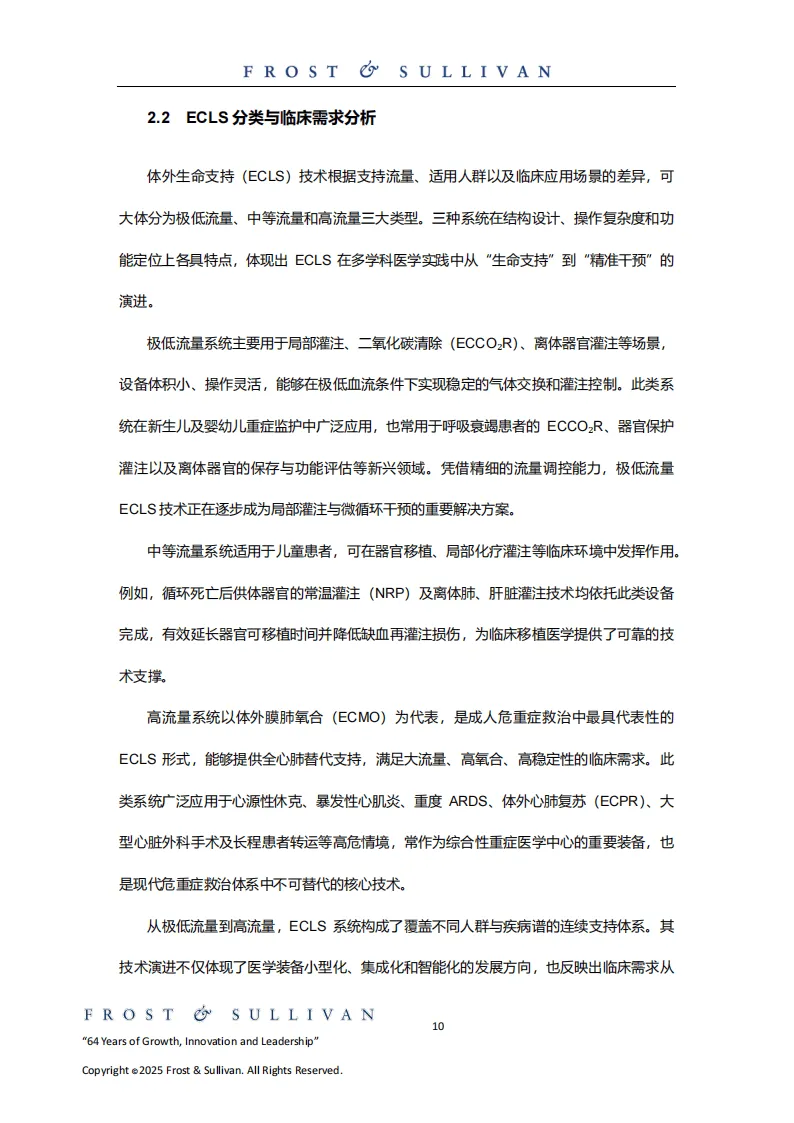 体外生命支持(ECLS)是通过体外循环设备替代或辅助衰竭器官功能的医疗技术体系,按流量分为极低、中等、高流量三类,分别适用于局部灌注、儿童患者治疗、成人危重症救治等场景,核心价值在于为患者争取治疗时间,应用场景正拓展至院前急救、移动医疗等领域。其中,体外膜肺氧合(ECMO)作为高流量ECLS的代表,可提供全心肺替代支持,广泛应用于心跳呼吸骤停、严重心肺功能衰竭等多种重症救治。