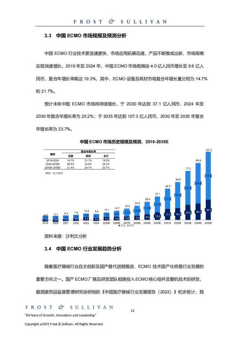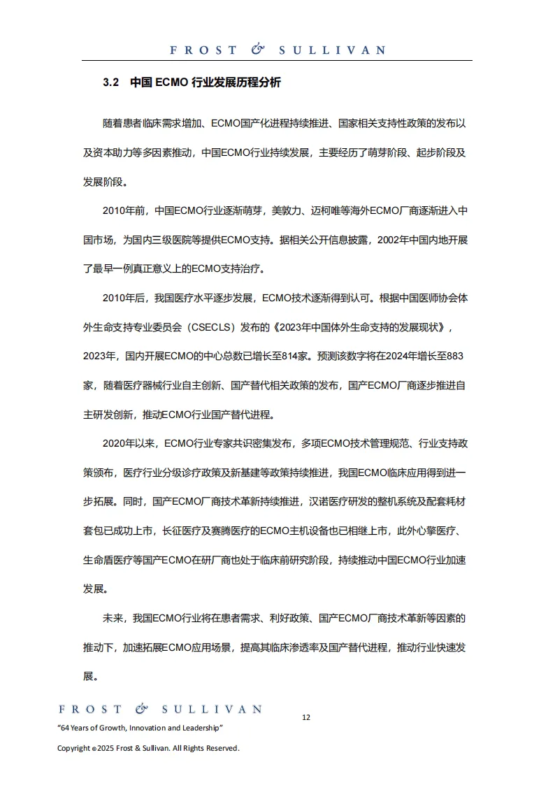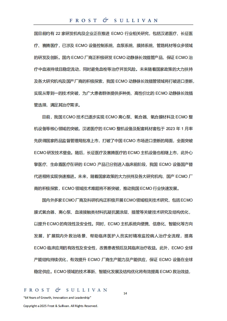 中国ECMO行业历经萌芽、起步阶段后加速发展,2023年开展ECMO的医疗中心达814家,预计2024年增至883家。市场规模增长迅猛,2019-2024年复合年增长率达19.3%,2024年达9.6亿元人民币,预计2035年将达107.3亿元人民币。国产替代进程持续推进,汉诺医疗、长征医疗等企业的产品相继上市,打破进口垄断,核心组件研发不断突破。
