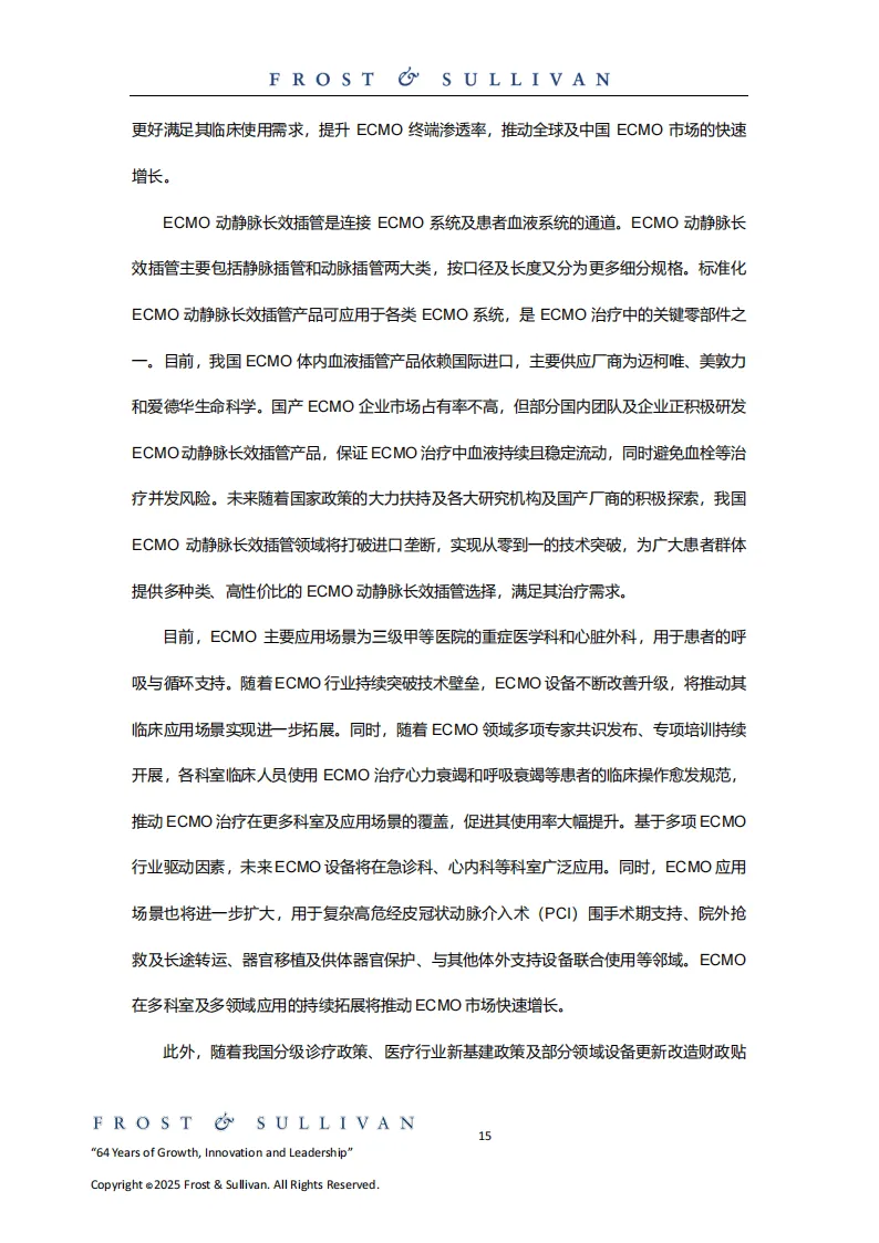 全球ECMO市场同样快速发展,2019-2024年复合年增长率为10.4%,2024年达6.3亿美元,预计2035年将达58.0亿美元。欧美及中国台湾地区起步早、普及广,美国、德国等应用场景广泛,专业团队建设完善。未来,全球及中国ECMO行业将朝着技术智能化、设备便携化、应用场景多元化方向发展,临床渗透率持续提升,国产替代进一步深化,诊疗网络不断完善,为危重症救治提供更有力的支撑。