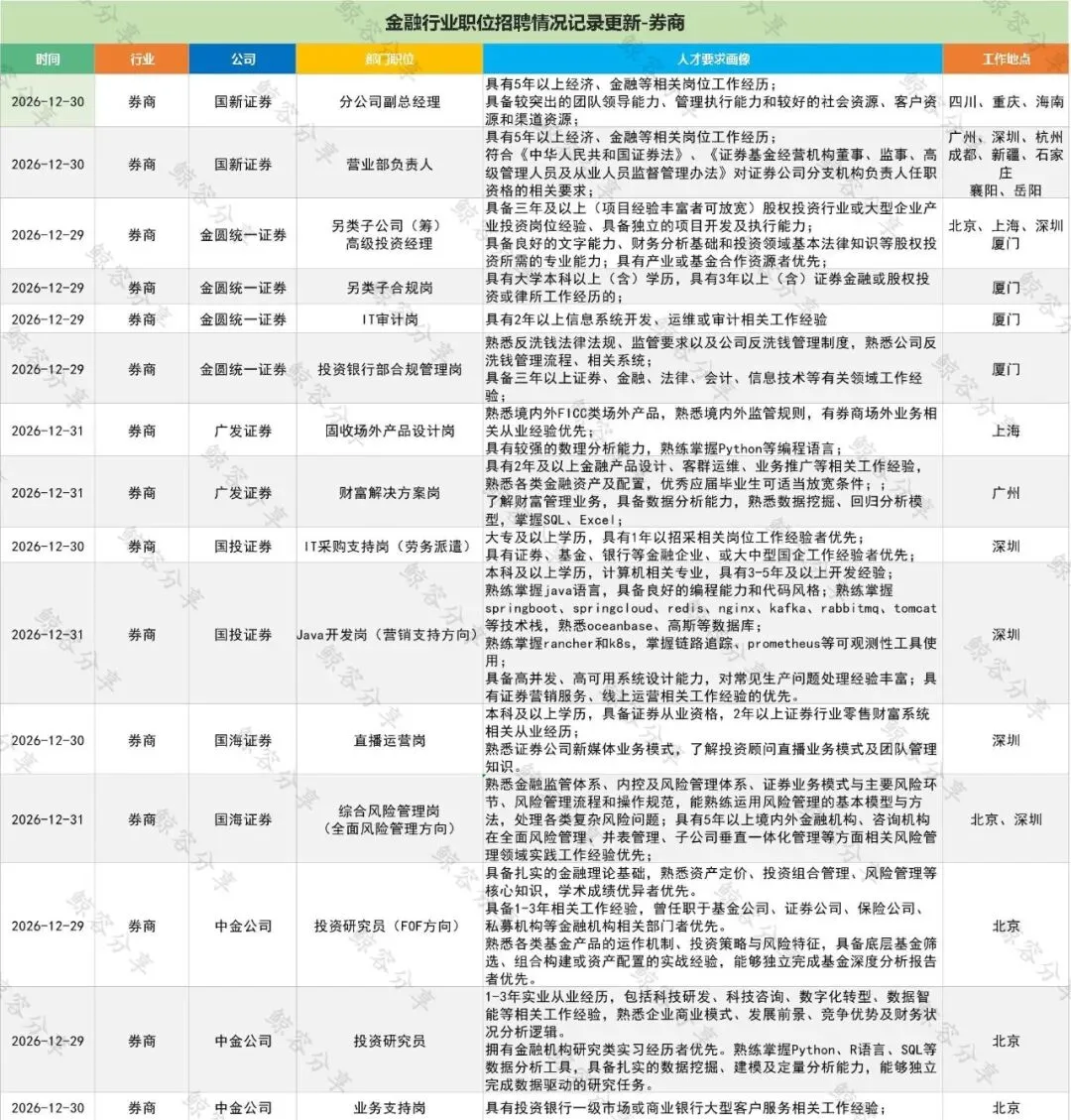 一周金融行业招聘动态收集—券商260104鲸容百晓生Human Resources关于我们专注金融领域咨询,持续收集和分享金融机构的招聘动态。以券商为核心,辐射公募、私募、银行、保险等金融行业领域。提供价值、整合资源、相互赋能。致力成为金融机构和金融人才交流资源和价值互换的桥梁一周金融机构招聘动态收集-券商END更多行业动态咨询,敬请点赞关注,我们将持续跟新素材来源官方媒体/网络新闻