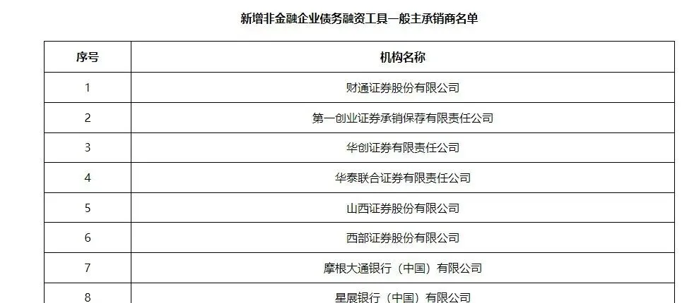 根据公告,新增财通证券、第一创业证券承销保荐、华创证券、华泰联合证券、山西证券、西部证券、摩根大通银行(中国)、星展银行(中国)等8家会员为非金融企业债务融资工具一般主承销商。