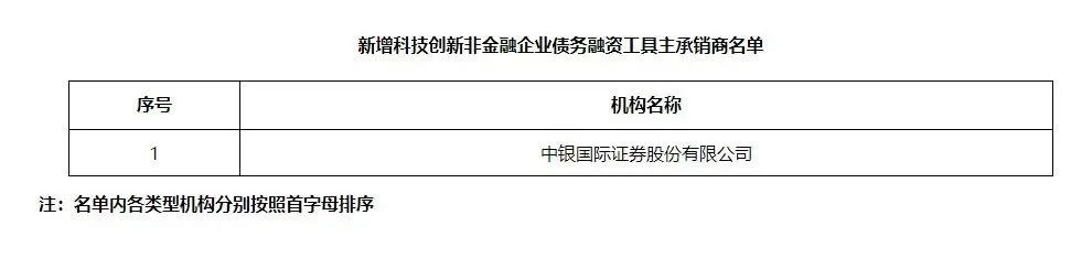 新增中银国际证券股份有限公司为科技创新非金融企业债务融资工具主承销商(可主承销科技创新债券等支持科技创新的债务融资工具)。