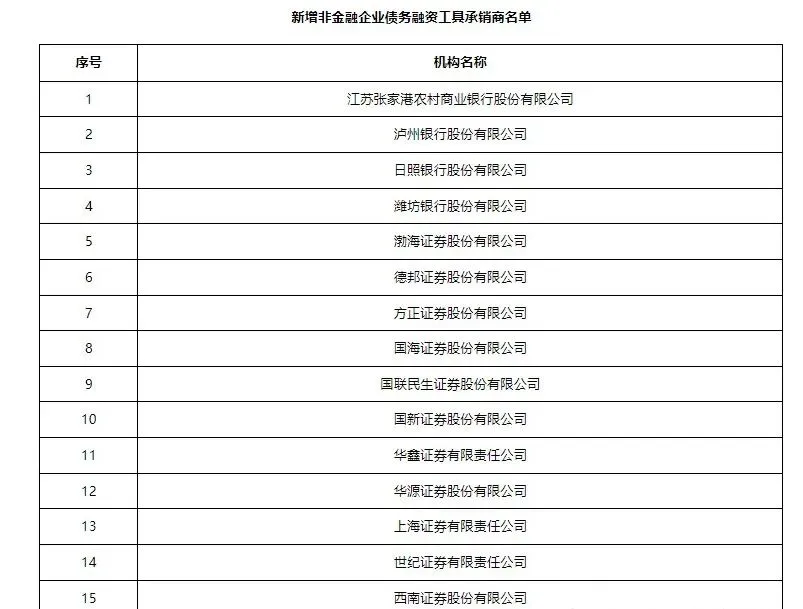 新增江苏张家港农商行、泸州银行、日照银行、潍坊银行、渤海证券、德邦证券、方正证券、国海证券、国联民生证券、国新证券、华鑫证券、华源证券、上海证券、世纪证券、西南证券等15家会员为非金融企业债务融资工具承销商。