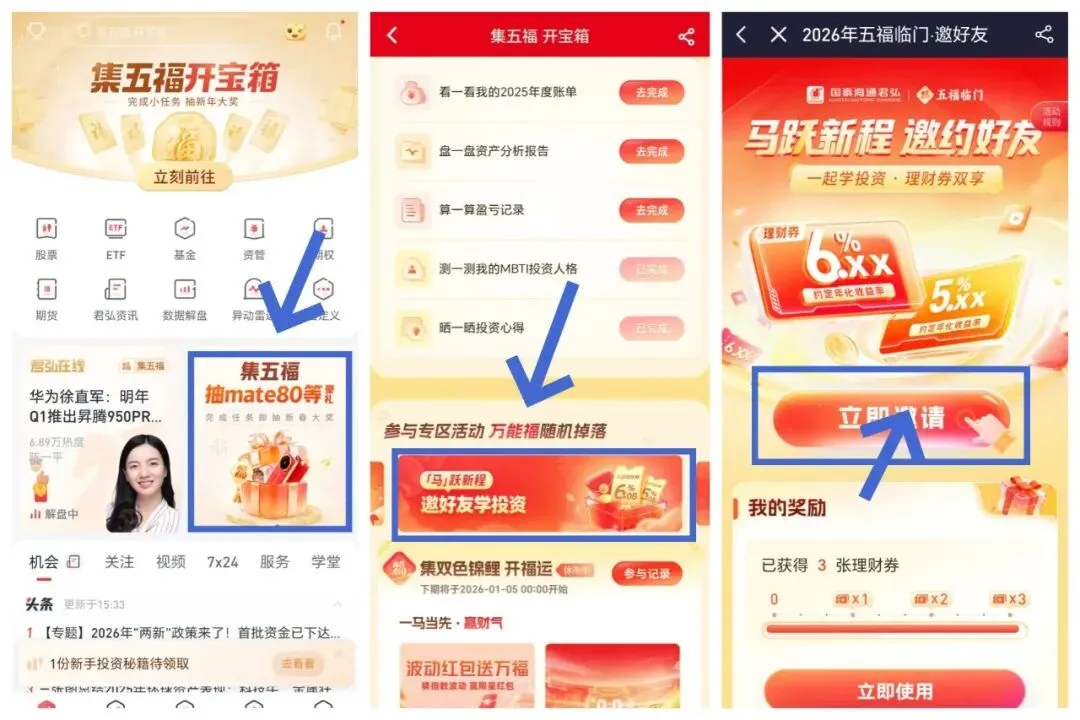 国泰海通APP首页-“集五福”页面下拉,找到“邀好友学投资”活动。邀请1位好友即可获得6.08%高收益理财券,每人最多可获得3张。每张券额度1万元,14天期限,3张合计收益69.96元。