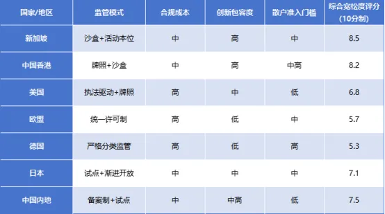 说明:综合合规成本(30%)、创新包容度(30%)、散户准入门槛(20%)、政策确定性(20%)加权计算