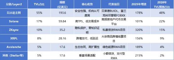 关键趋势:以太坊仍占主导,但Layer2和新兴公链增速更快,2025年ZKsync、Solana的RWATVL增速均超100%,多链格局将进一步巩固