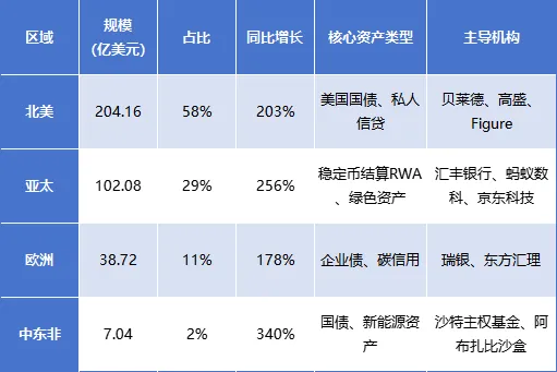 2025年全球RWA市场实现爆发式增长,总规模突破352亿美元,较2024年增长217%,增长动力从“加密原生项目驱动”转向“传统金融机构主导”,多链部署格局成型,区域市场呈现“北美领跑、亚太追赶”的态势。