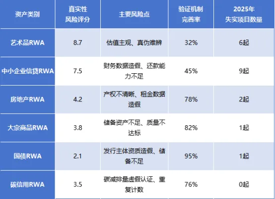 资产失实问题:部分RWA项目存在底层资产虚假、估值虚高问题,估值虚增可达10-20倍,主要集中在中小企业信贷、艺术品RWA领域,2025年曝光的资产失实项目达19起,涉及规模达8.7亿美元。