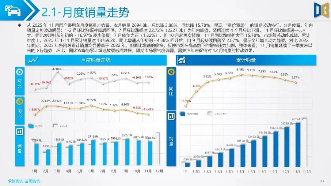 从 2025 年 11 月全国车市概况数据看,呈现 “国产绝对主导、进口微增、商用车稳定” 的特征:本期月度销量中国产占 87.01%,进口 1.77%,商用11.22%,国产车型是市场核心支撑。11 月销量 2304.0k,环比降 2.85%,同比降 14.07%,是年内同比降幅较大的月份;累计销量 24070.1k,同比从年初 - 17.23% 回升至 3.09%,全年整体呈修复态势。