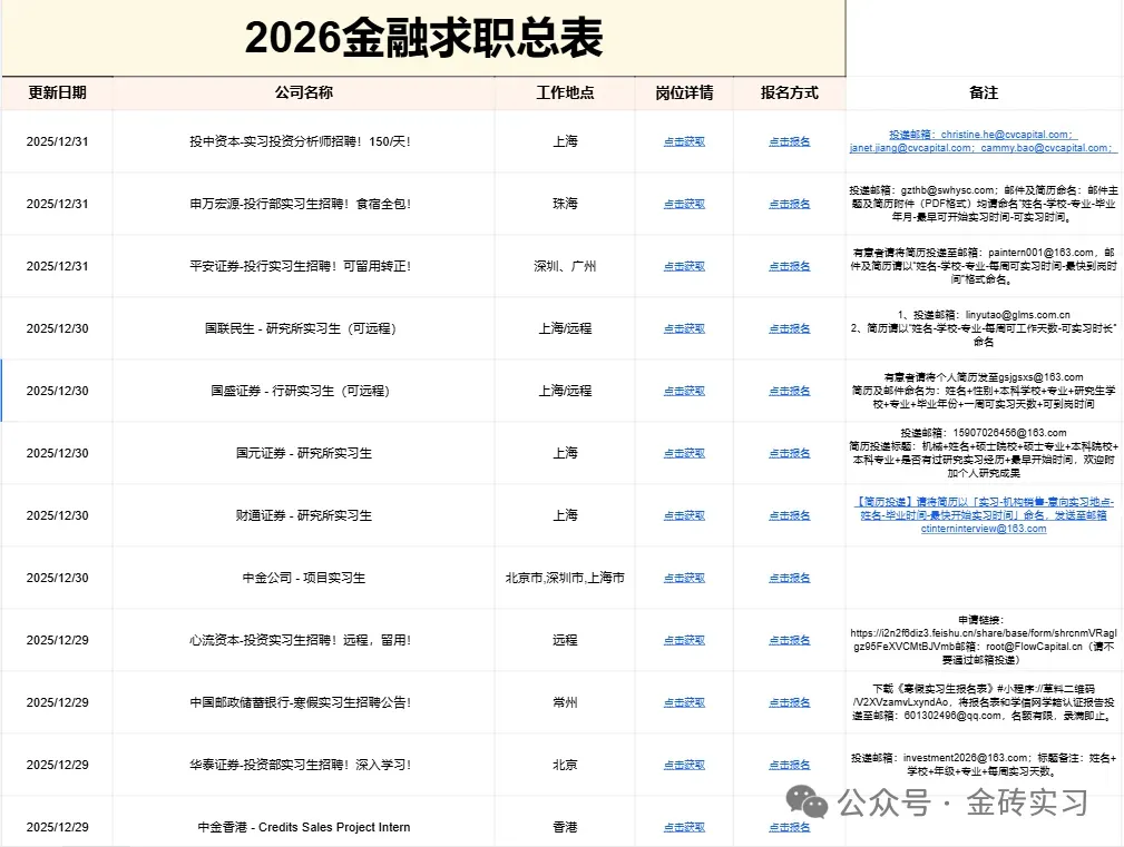 .................... 其他岗位汇总 2025-2026年度会员将获得25个+招聘汇总表权益,每个表格将持续更新到周期结束 覆盖行业全面:银行/证券/基金/保险/期货/互联网/电子商务/计算机软件/通信/国家机关/高校/研究所/事业单位 /教育/会计师事务所/咨询公司/法律/消费品/零售/服装/家具/贸易/制造业/汽车/电子/电器/机械/石油/钢铁/电力/能源/煤矿/化工/生物/制药/医疗/农林/畜牧/媒体/广告/旅游/公关/文化/影视/酒店......... 同时还有企业性质细分,包含国企、民企、外企等。 个性化筛选:所有信息均支持自主筛选,行业-企业-截止时间-投递链接-工作地点…,分门别类,一目了然,既能海投,又能精准投递。 每周校招截止提醒⏰:每周截止校招专属提醒,不错过任何一个机会! 信息差,是影响大部分同学就业的关键因素! 上一届校招(秋招+春招)期间, 共计汇总企业10000+ 订阅人数10000+ 包括国央企、事业单位、民企、外企、合资企业......。