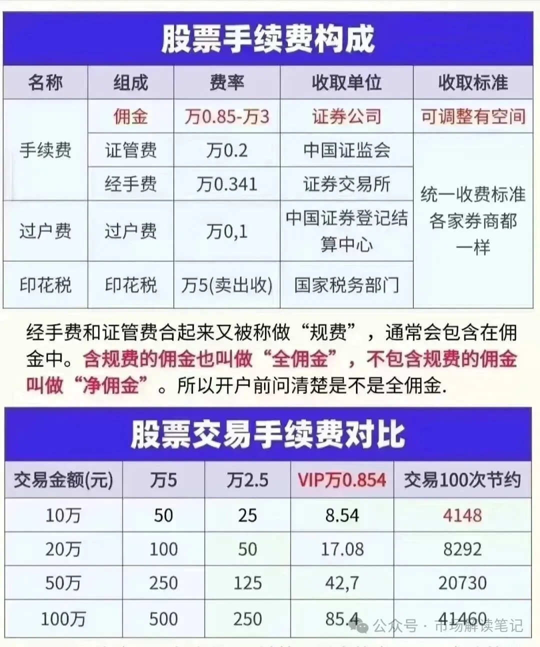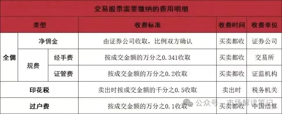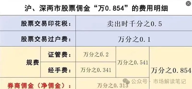 手续费=全佣(万0.854)+过户费(固定万0.1)+印花税(固定万5)
