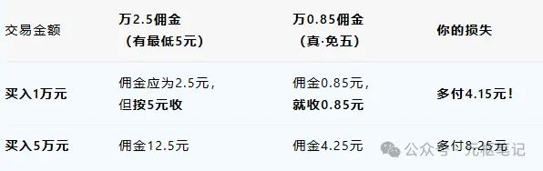 现在:万0.85免五,同样10000块,手续费0.85元,买+卖一共不到2块钱!
