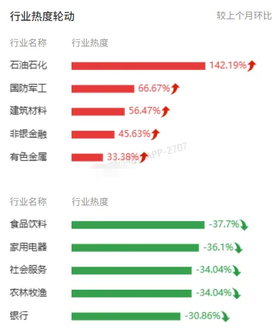 委内瑞拉地缘问题带动石化行业本月热度飙升,本月热度上升142%,同样受益的还有军工行业,叠加航天热度,本月热度提升超过6成;非银金融则由于保司的增长逻辑愈发受到市场认可,本月热度提升45%;有色行业热度持续大涨超过3成,大宗商品涨价根本停不下来。