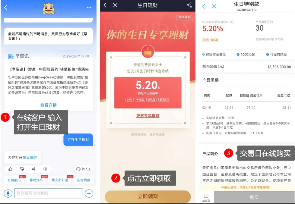 领取路径为君弘APP→首页→在线客户→输入“生日理财”→立即领取。产品期限14天,年化收益率达5.2%,1000元起购,最高额度根据客户星级不同在5万—20万之间。