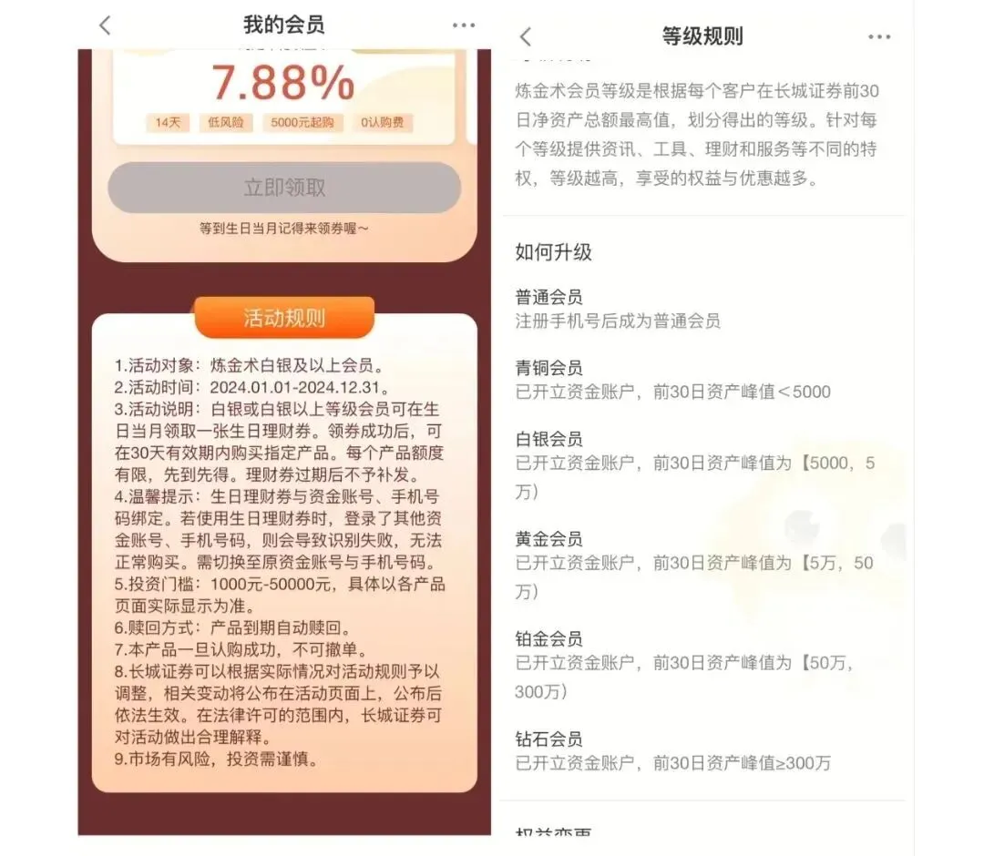 领取路径为长城炼金术APP→首页→我的→我的会员/我的福利。产品期限14天,年化收益率7.88%,5000元起购,最高额度5万元。该福利针对白银及以上会员,收益约151元。
