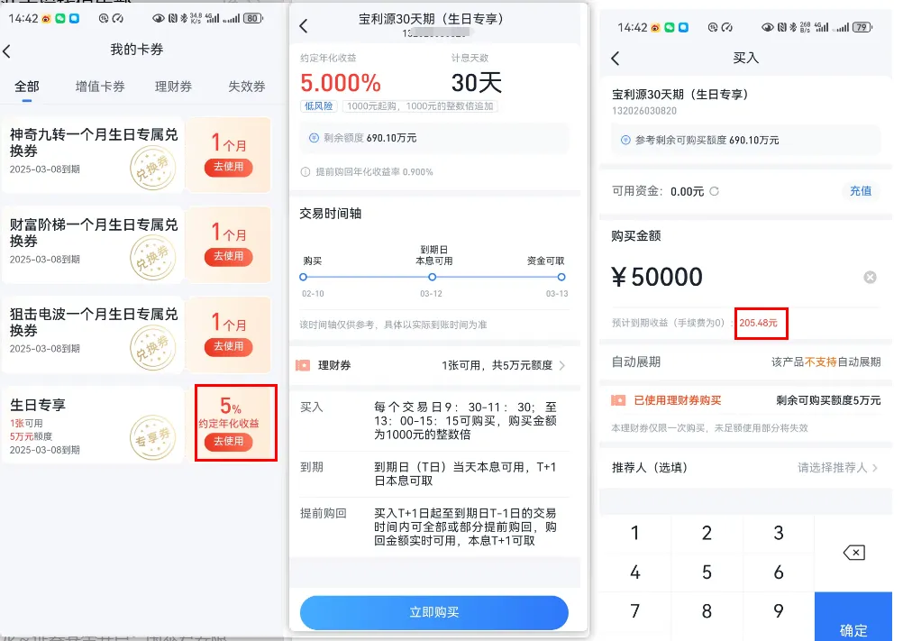 可通过东方财富APP→理财→我的理财→理财卡券→活动券领取;或在生日前一天通过“东方财富证券”公众号回复“生日惊喜”获取积分兑换理财券。产品期限14天,年化收益率高达8.18%,最高额度1万元。收益约31元。