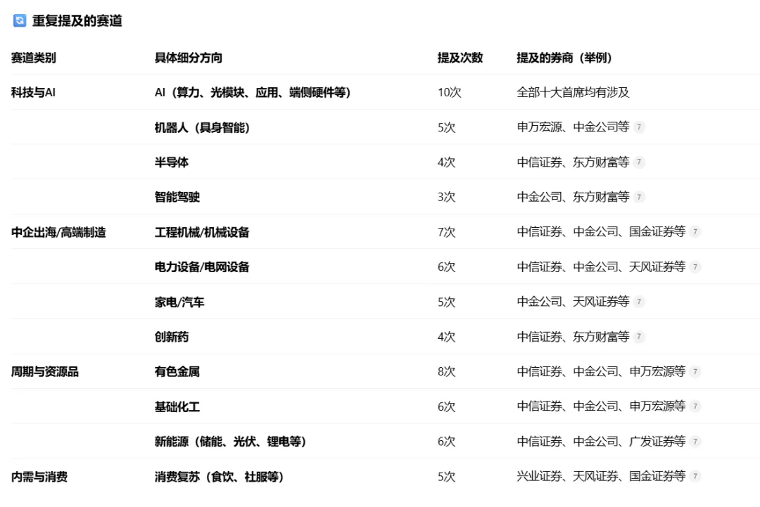 AI赛道全部都提到了,被提到10次。其次是有色金属,提到8次,然后是机械设备提到7次。