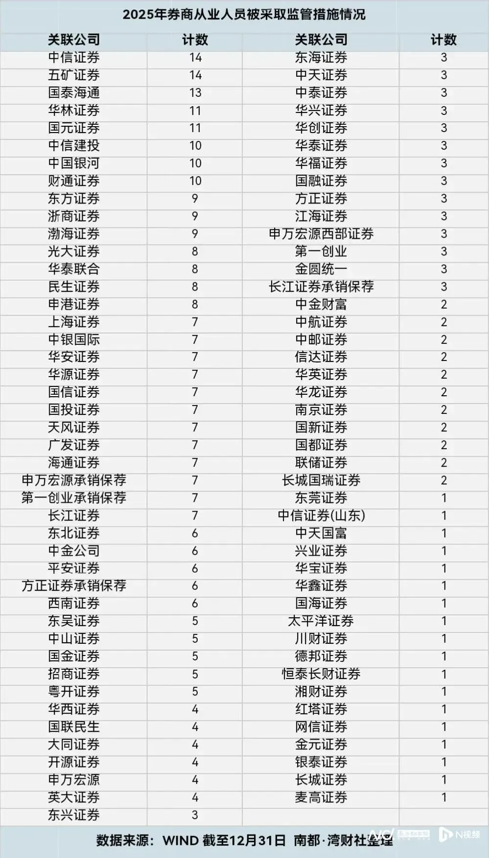 400名从业人员被点名罚单呈现四大特征证监会强监管态势持续,南都·湾财社记者通过Wind梳理发现,2025年,证监会系统在年内先后对87家券商的400名从业人员采取了监管措施。