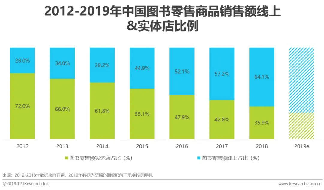 图书零售额线上占比逐年提升,2018年占比达到64.1%,预计2019全年占比达七成。