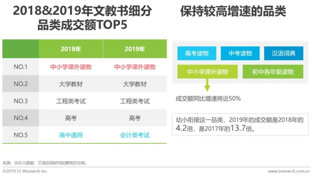 根据京东大数据,2019年文教书成交额最高的细分品类前三是:中小学课外读物、大学教材和工程类考试用书;中小学课外读物、高考读物、初中各年级读物成交额保持较高同比增长。近几年,国家提倡大语文,中小学语文教育发生变革,中小学课外读物作为文教书第一大品类,2019年成交额同比增速将近50%,预计在2020年,其成交额还将走高。上过初高中的同学都知道,《五年高考 三年模拟》是辅导书界的”小霸王“,带给80后、90后难以磨灭的记忆。现在这一系列图书依旧“折磨”着零零后,相关图书2019年销量是2018年的近三倍,是同步教辅中NO.1品种。