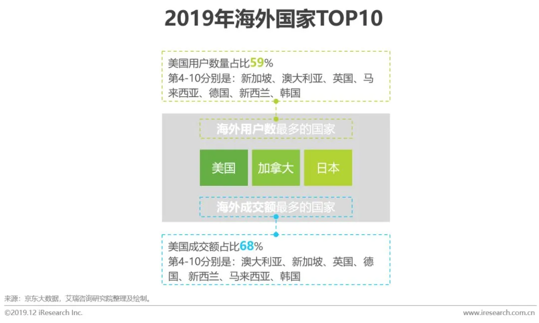 京东一直在积极布局海外市场,实力挖掘跨境线上红利,并重点开辟京东全球售业务。通过京东数据可以看出,在2019年京东图书在海外销售爆发式增长,无论用户数量还是成交额,美国、加拿大和日本都是前三市场。