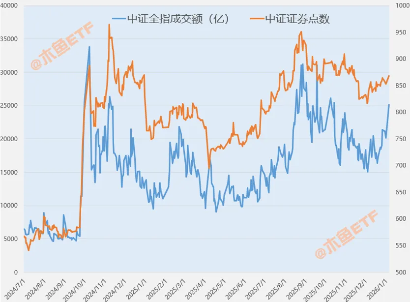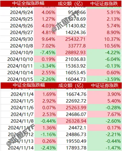 我们对比下从2024年7月以来,中证全指的成交额和中证全指证券指数的走势。可见从趋势感来看,二者是有较高的一致性共振。因此,从过往经验来看,成交回落券商价值也会有压力。