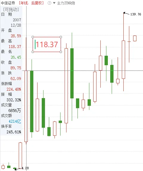 同期的中信证券,后复权价从4.28元起步,高点2007年11月05日,达到118.37元,上涨2765%,是的你没看错,那一轮牛市,中信证券上涨了27倍,不是27%,不是2.7倍,而是27倍!什么叫牛市,这就是。