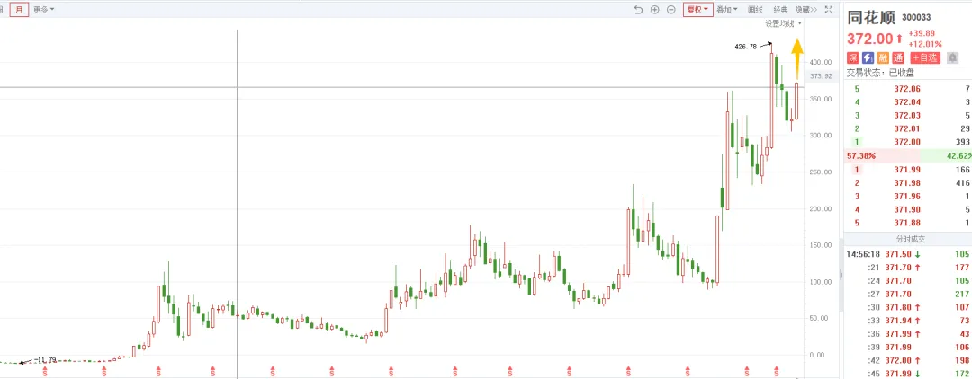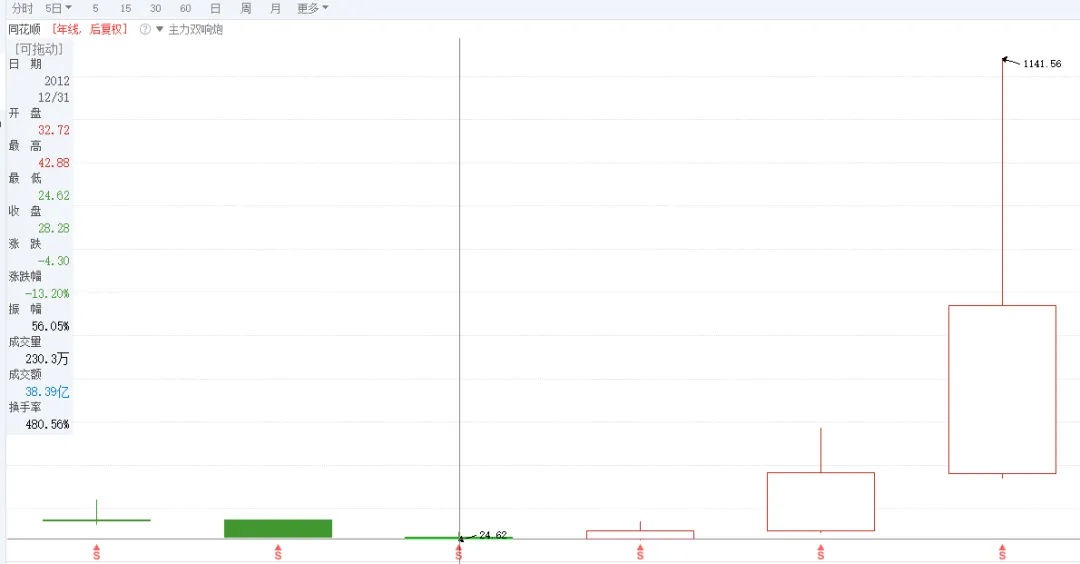 同期的同花顺,后复权价从24.62元起步,高点2015年6月5日,达到1141.56元,上涨4636%,是的你没看错,那一轮牛市,同花顺上涨了46倍,不是46%,也不是4.6倍,而是46倍!什么叫牛市,这就是。