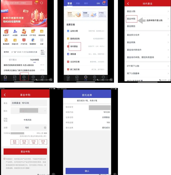 上述操作完成后,T+1日份额确认,T+2日晚开启夜市委托后,进入持仓页面,选中161226基金,点击“卖出”。输入卖出数量,设置卖出价格(可选择实时现价或限价委托),确认成交即可完成流程。