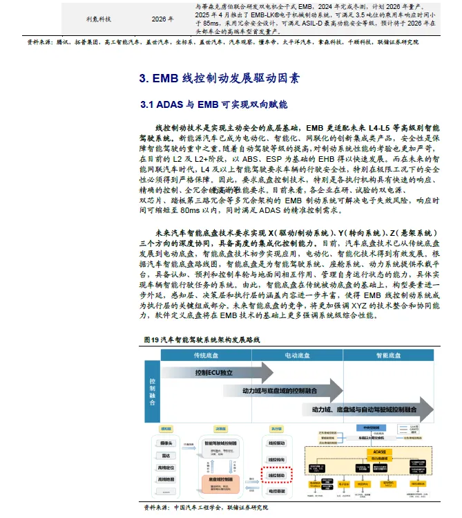 EMB 软硬件解耦的系统架构更适配未来智能网联汽车制动的最终解决方案。EMB 取消了iBooster、制动主缸、液压管路等零部件,通过电信号控制分布在轮毂处的执行器直接建立制动力,是真正意义的线控制动,可实现区域/中央集中控制融合。EMB 具备制动响应快(≤100ms)、效率高、系统质量轻等优点,满足ADAS 对快速、精准制动的需求。