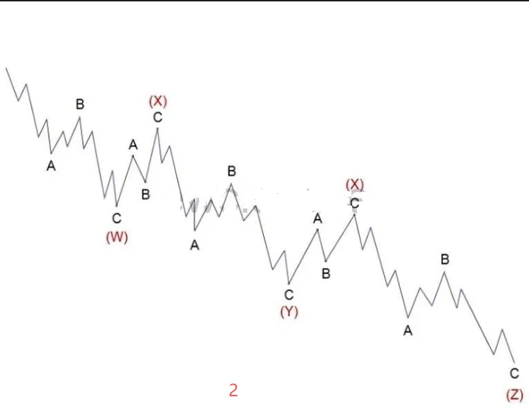 有时候锯齿调整浪会连续发生两次或至多三次,特别是当第一个锯齿浪没有回撤到常见目标时。在这些情况下,每个锯齿浪会被一个调整浪分隔开,由此就产生了所谓的双重锯齿浪(图1)和三重锯齿浪(图2)。