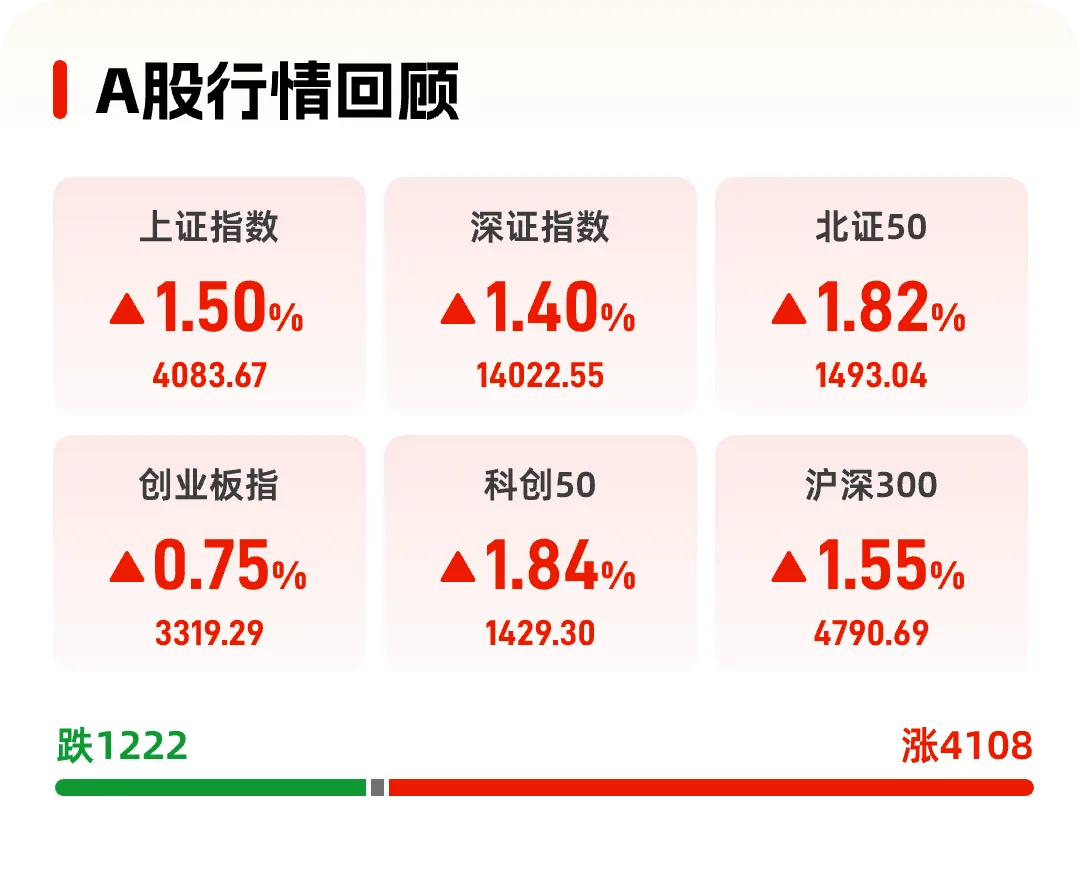 周二A股高开高走,主要股指均实现上涨,收盘沪指创自2015年7月以来的新高点,深圳成指也创2022年2月以来的新高,创业板指早盘一度下跌午后也实现上涨。沪深两市成交额超过2.8万亿元,量能放大明显。行业板块基本全线飘红,有色、军工、证券、石油、化工、计算机等行业涨幅居前,题材股方面,人脑工程、机器人、钛金属、草甘膦等题材热点表现活跃,两市上涨股票数量超过4100多只,上涨比例接近八成。