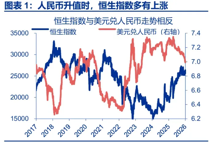 人民币升值时,港股盈利、资产的重估效应与外资的回流,或是港股上涨的主因。1)货币价值重估,当人民币升值时,港股公司赚取的人民币利润折算成港币时会放大。2)资产重估效应,在港上市地产股等底层资产以人民币计价,在升值时会面临价值重估。3)全球配置的比较效应,人民币汇率走强多指向中国基本面具有一定相对优势,这会令全球投资者配置更多中国资产。