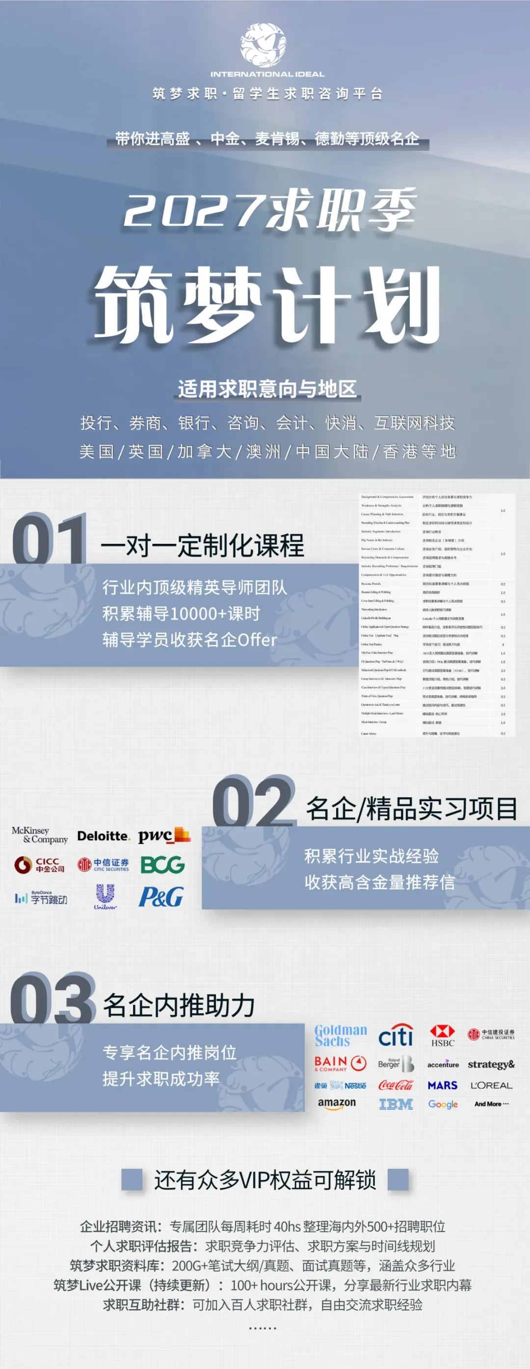 筑梦 INTERNATIONAL IDEAL(2014年成立并注册于美国),是北美最早成立的留学生求职咨询平台之一,目前覆盖全球留学生超过80万人。我们荣登“福布斯华人精英TOP100”以及“胡润百富创业领袖”榜单,至今已帮助 8000+ 学员获得来自Goldman Sachs、McKinsey、Deloitte、P&G、Google、Meta等名企的Offers。我们的服务包括:求职辅导、背景提升、名企内推、海外游学等;商务合作请联系:Coop@internationalideal.com