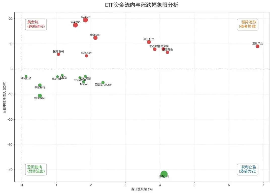 1. “渣男”券商的剧本又演了一遍 看一眼散点图的右下角(获利止盈区),“证券公司”这个点孤零零地挂在最下面(流出41亿)。 这是一次非常经典的“主力诱多”。券商大涨往往能带动全场情绪,散户一看到券商动了就喊“牛市来了”往里冲,而主力恰恰利用这个时间窗口完成大规模的筹码派发。对于券商ETF,今天的建议是:只卖不买。