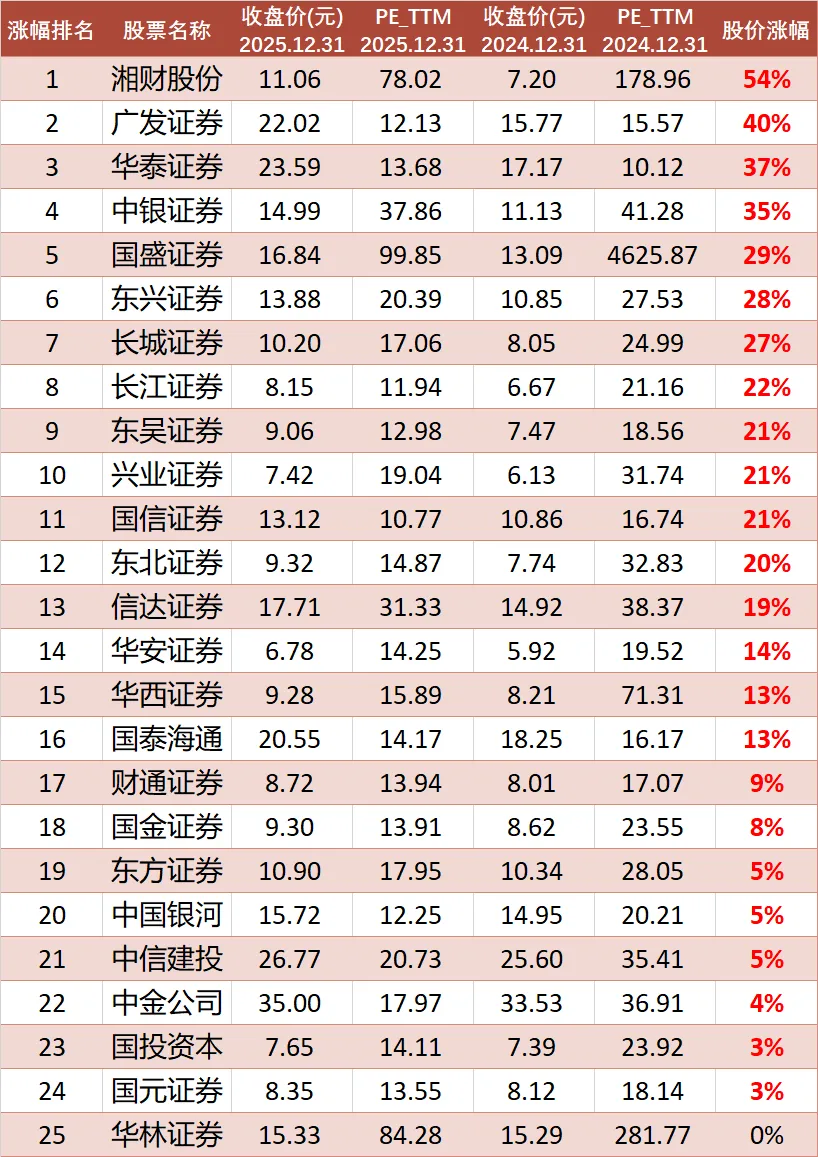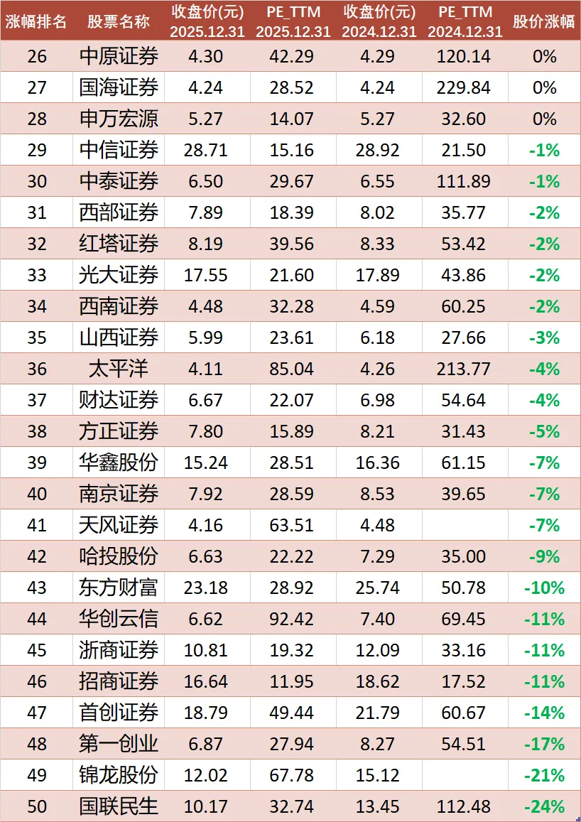 50只券商股票,2025年股价涨跌幅数据截至2026年1月7日,A股自2025年12月17日起已实现14连阳,创1992年3月以来最长连阳纪录。股市大盘上涨,券商是最直接受益的行业,因为交易量增加会带来佣金的增加,也通常最终会导致券商股价的上涨,事实如何呢?股价涨幅=2025年12月31日收盘价/2024年12月31日收盘价 -1,前复权。50只券商股中,有24只股票2025年股价涨幅大于0,占比48%,比想象中的要少。股价涨幅前3名分别为:湘财股份(54%),广发证券(40%),华泰证券(37%)。股价跌幅超过10%的共有8家,其中国联民生(-24%)、锦龙股份(-21%)两家公司跌幅超过20%。最新市盈率(2025年12月31日)显示,50只股票的PE_TTM分布在10倍至100倍之间,低于15倍的有15只股票,市盈率最低的3家公司分别是:国信证券(10.77倍)、长江证券(11.94倍)、招商证券(11.95倍)。去年同期(2024年12月31日),券商股市盈率低于15倍仅有华泰证券1家。单纯从这个视角看,一些券商股的价格仍不算贵。如果“牛市”真来了,买券商股大概率不会亏钱,问题是你要能确定“牛市”真的会来临,你确定吗?数据只代表历史,投资最重要的是要能看懂公司的未来,买股票就是买公司,不懂不碰。