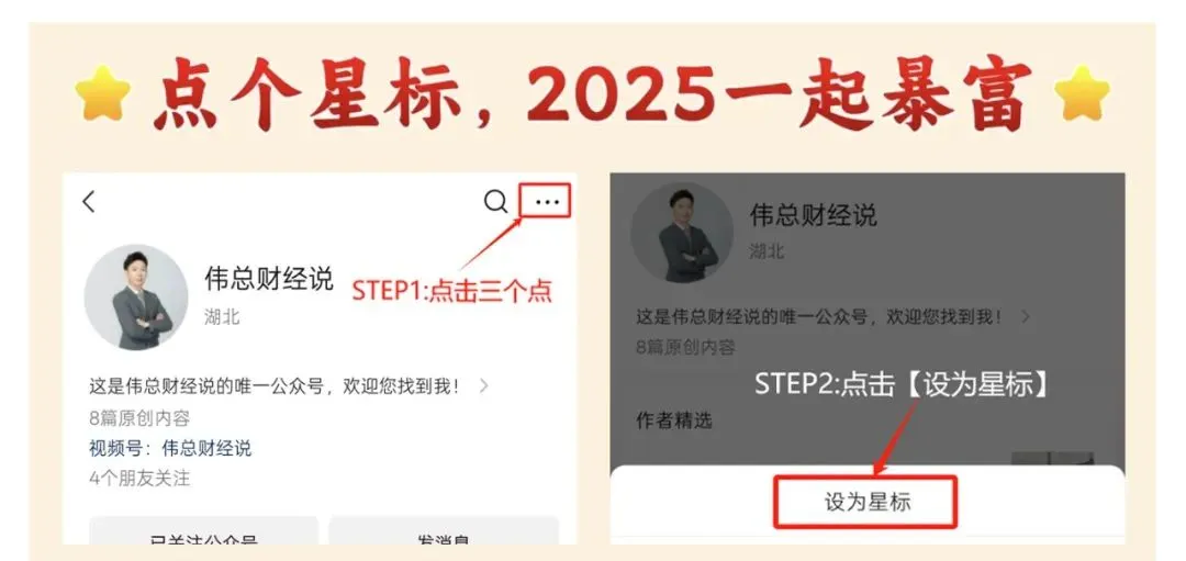 1、请点击公众号右上角三个点图标,选择“设为星标”即可。